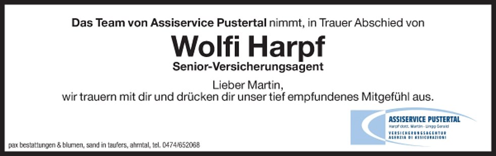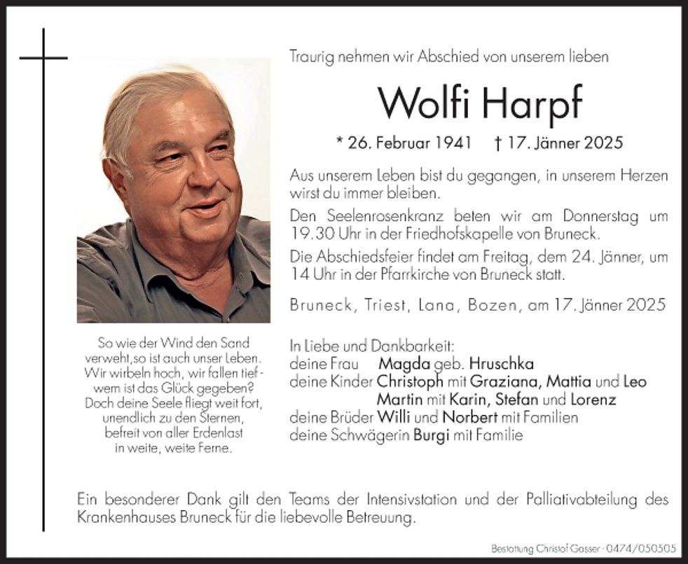 Die Abschiedsfeier findet am Freitag, dem 24. Jänner, um 14 Uhr in der Pfarrkirche von Bruneck statt.