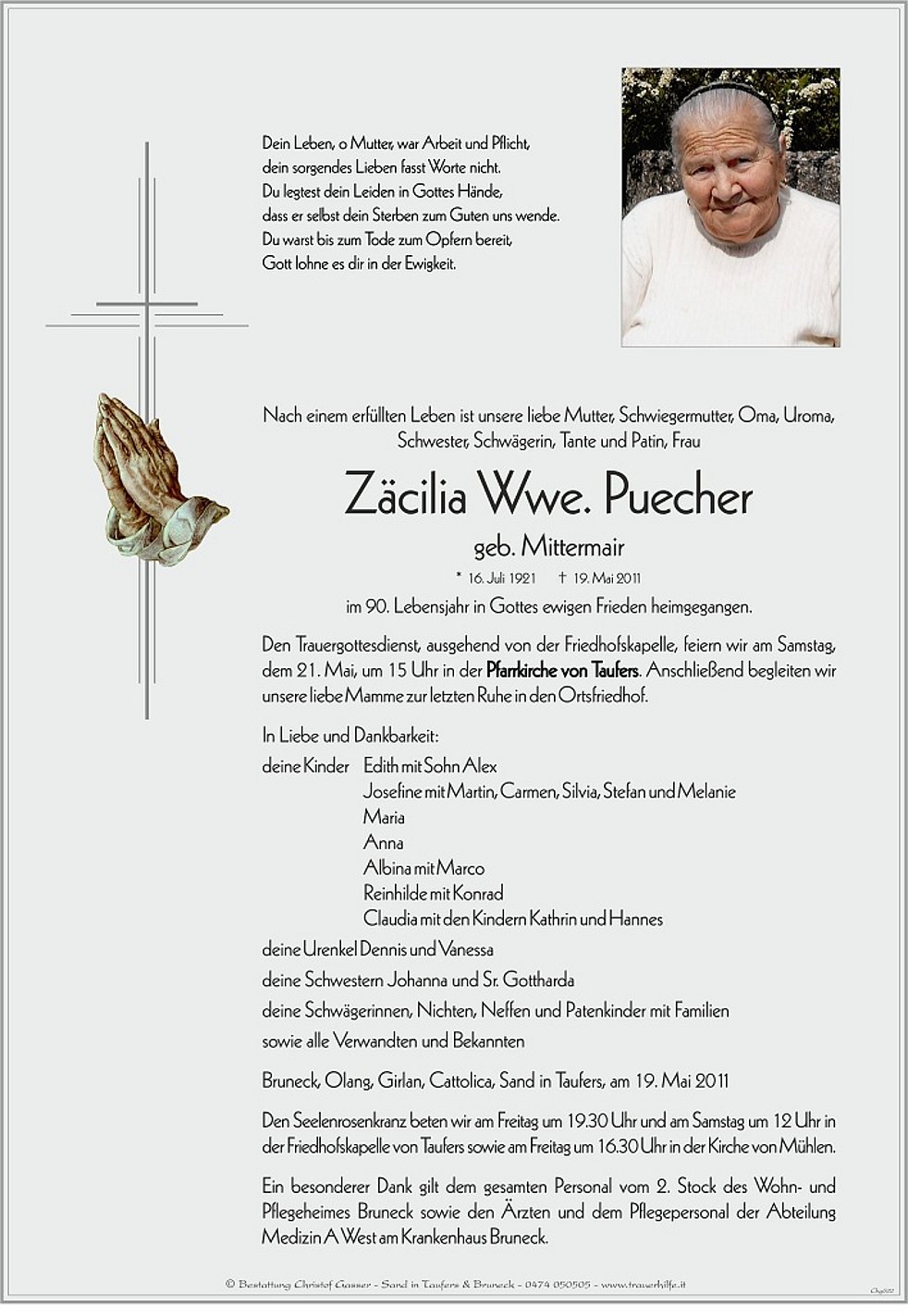 Den Trauergottesdienst, ausgehend von der Friedhofskapelle, feiern wir am Samstag, dem 21. Mai, um 15 Uhr in der Pfarrkirche von Taufers. Anschließend begleiten wir unsere liebe Mamme zur letzten Ruhe in den Ortsfriedhof.