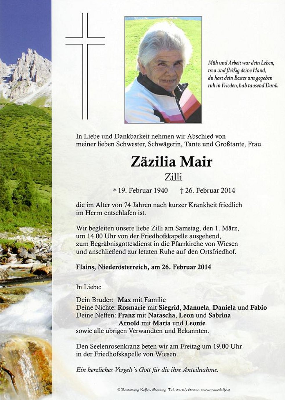 Wir begleiten unsere liebe Zilli am Samstag, den 1. März, um 14.00 Uhr von der