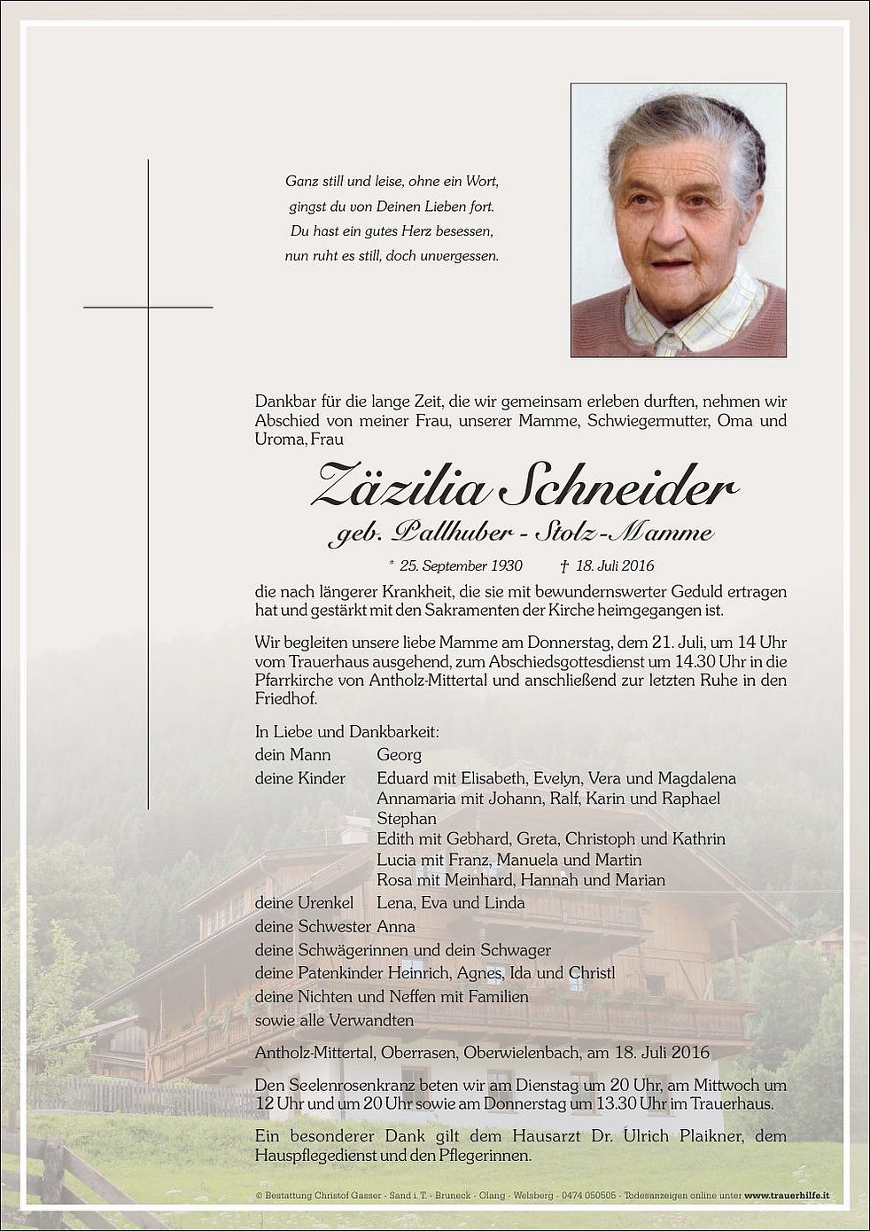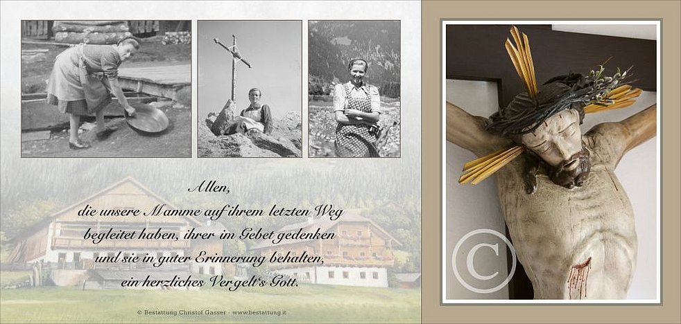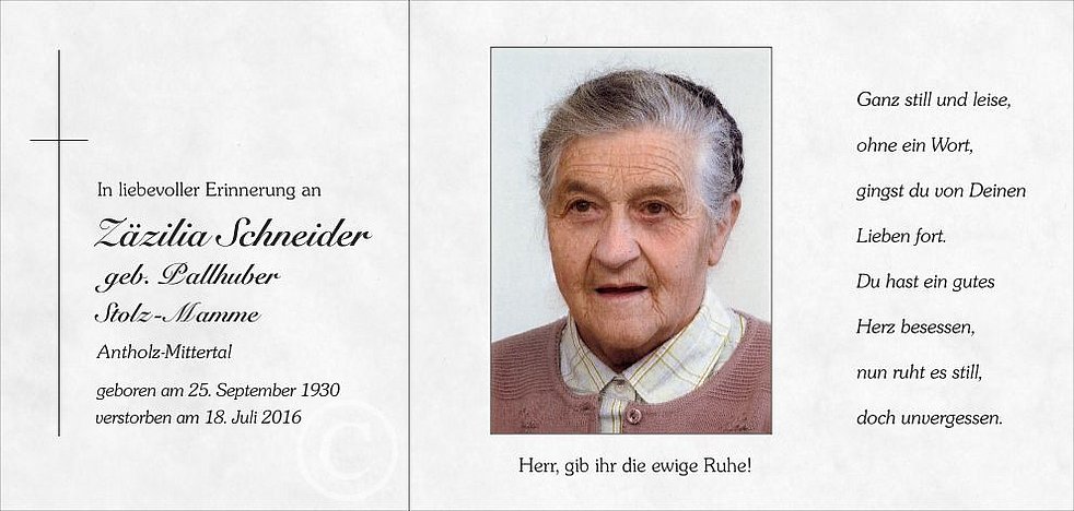 Wir begleiten unsere liebe Mamme am Donnerstag, dem 21. Juli, um 14 Uhr vom Trauerhaus ausgehend, zum Abschiedsgottesdienst um 14.30 Uhr in die Pfarrkirche von Antholz-Mittertal und anschließend zur letzten Ruhe in den Friedhof.