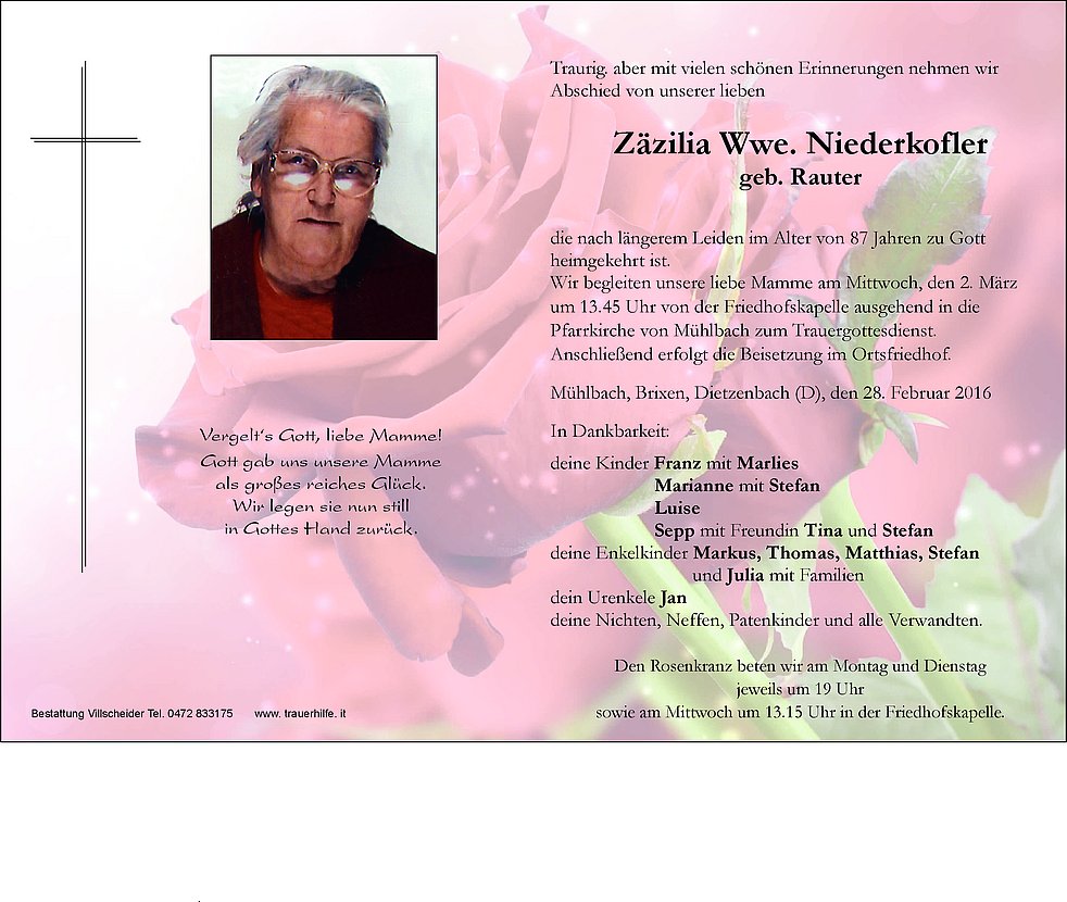 um 13.45 Uhr von der Friedhofskapelle ausgehend in die Pfarrkirche von Mühlbach zum Trauergottesdienst.