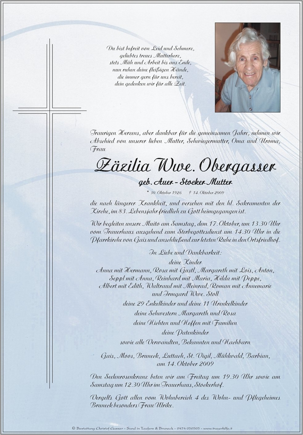 Wir begleiten unsere Muito am Samstag, dem 17. Oktober, um 13.30 Uhr vom Trauerhaus ausgehend zum Sterbegottesdienst um 14.30 Uhr in die Pfarrkirche von Gais und anschließend zur letzten Ruhe in den Ortsfriedhof.