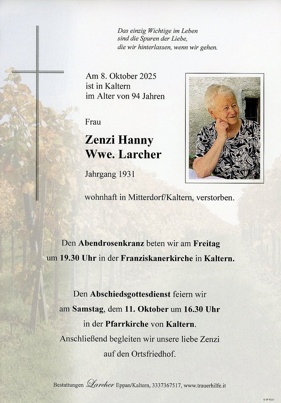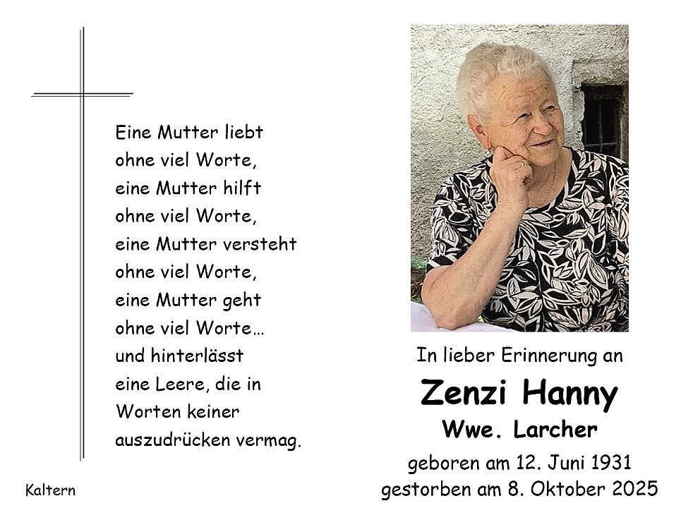 Den Abschiedsgottesdienst feiern wir am Samstag, dem 11. Oktober um 16.30 Uhr in der Pfarrkirche von Kaltern. Anschließend begleiten wir unsere liebe Zenzi auf den Ortsfriedhof.
