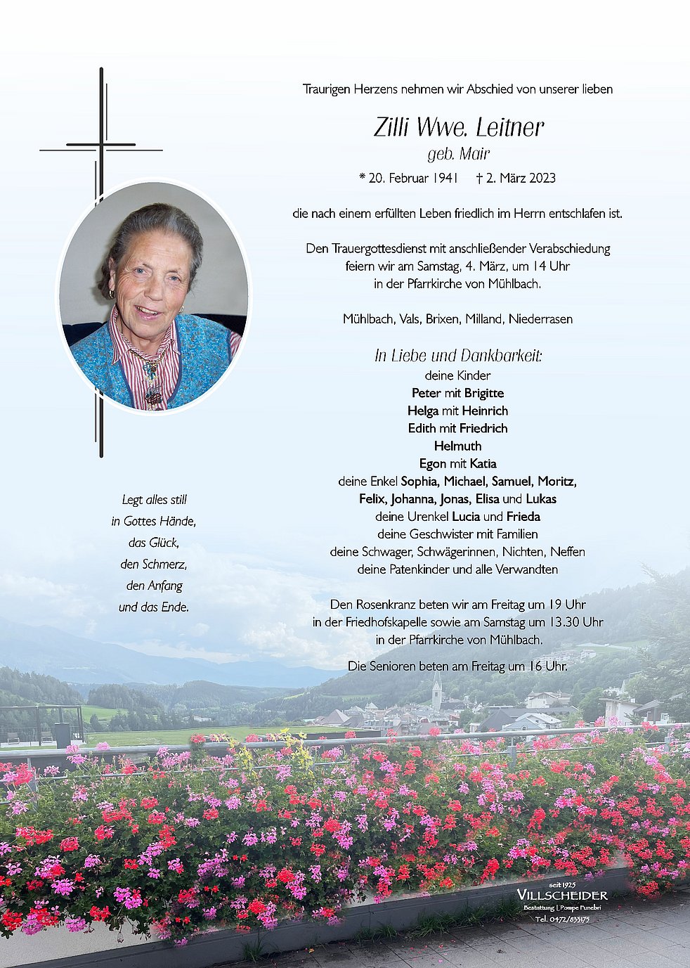 Liebe Cille ! Es isch la ungefähr a Munat her ,dass die Mame und i di bsuicht hom .Mior sein olm recht giarn zi dir gong und du hosch ins ollohond dozählt fa fria .Schode ,dasse iatz schun gion gimiosst hosch .Ruhe in Frieden liebe Cille und den Angehörigen mei Beileid.