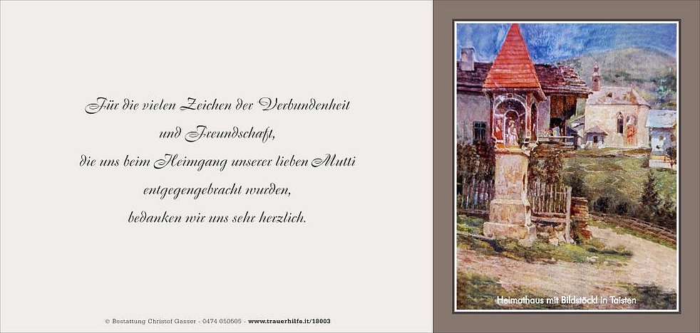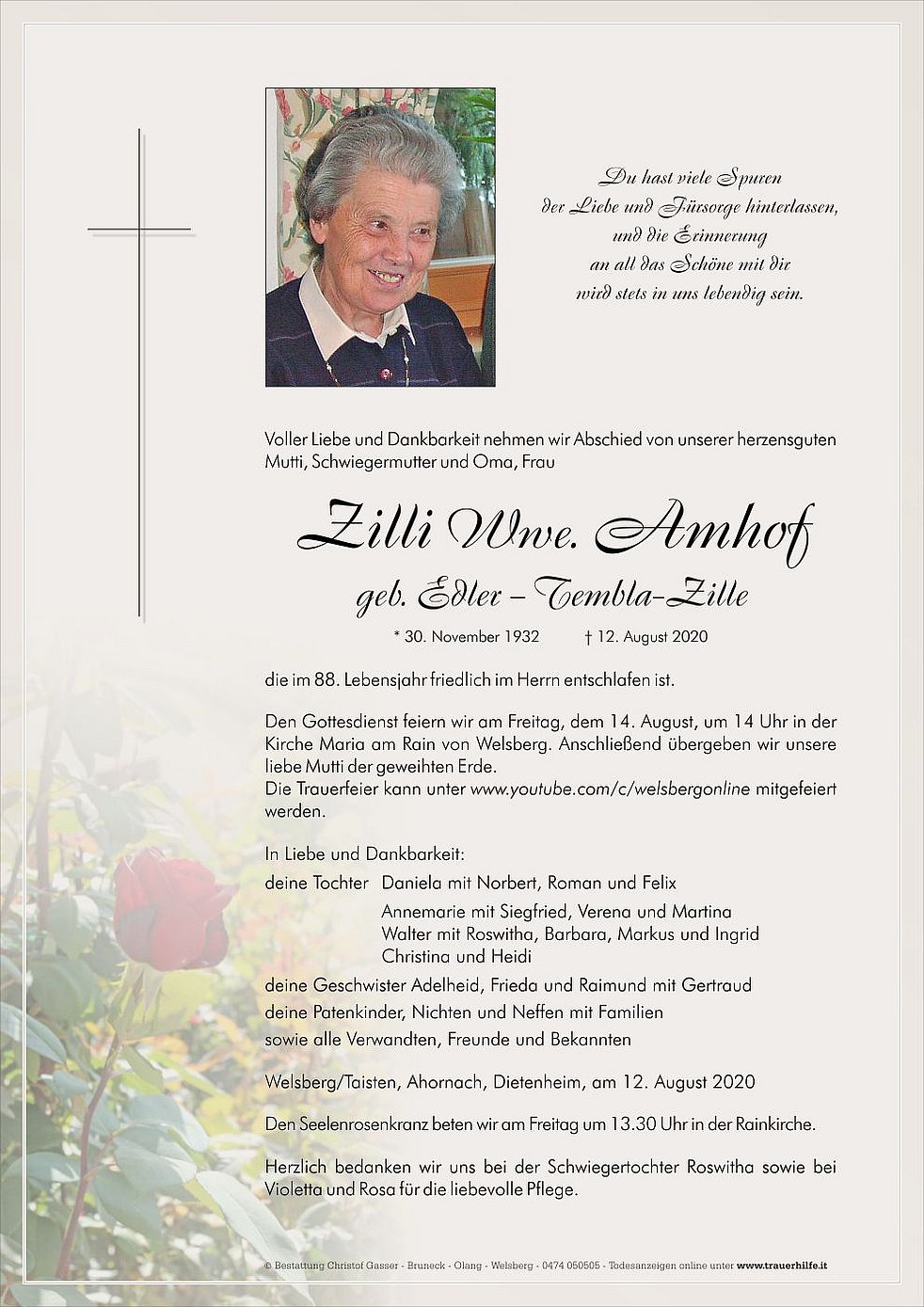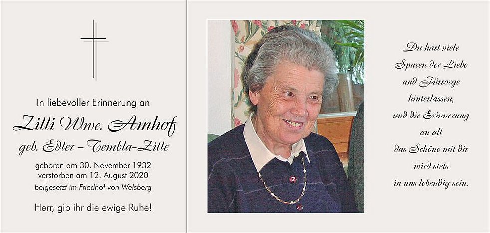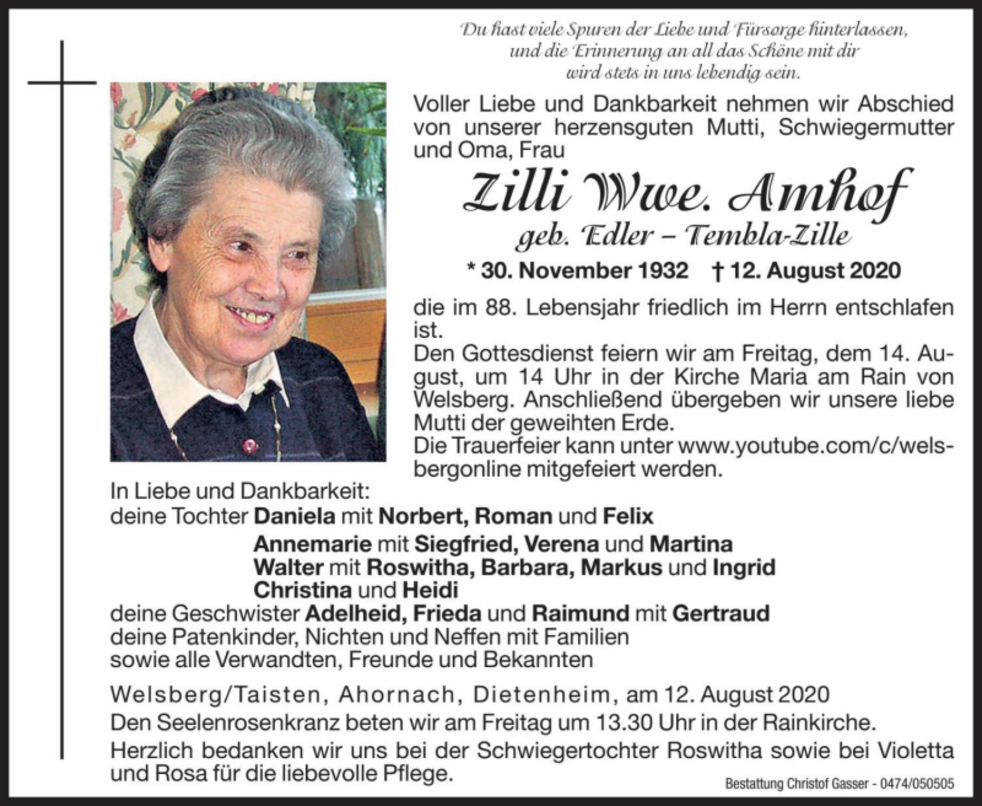 Den Gottesdienst feiern wir am Freitag, dem 14. August, um 14 Uhr in der Kirche Maria am Rain von Welsberg. Anschließend übergeben wir unsere liebe Mutti der geweihten Erde.