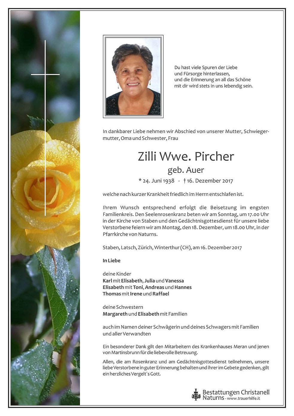 Ihrem Wunsch entsprechend erfolgt die Beisetzung im engsten Familienkreis. Den Seelenrosenkranz beten wir am Sonntag, um 17.00 Uhr in der Kirche von Staben und den Gedächtnisgottesdienst für unsere liebe Verstorbene feiern wir am Montag, den 18. Dezember, um 18.00 Uhr, in der Pfarrkirche von Naturns.