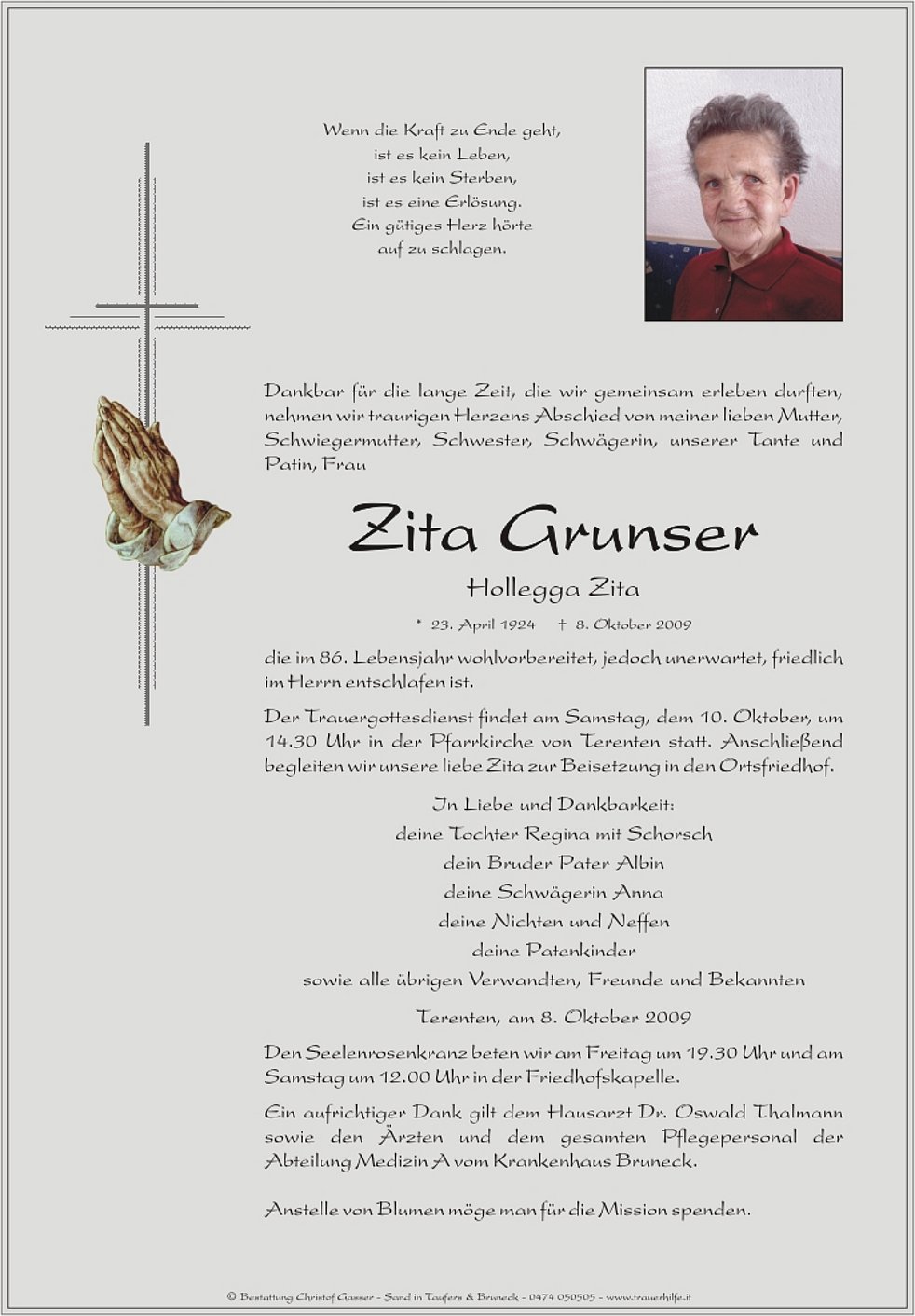 Der Trauergottesdienst findet am Samstag, dem 10. Oktober, um 14.30 Uhr in der Pfarrkirche von Terenten statt. Anschließend begleiten wir unsere liebe Zita zur Beisetzung in den Ortsfriedhof.