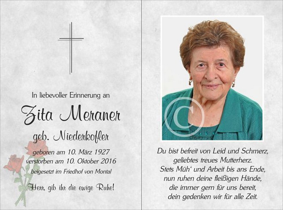 Gemeinsam begleiten wir unsere liebe Mamme am Freitag, dem 14. Oktober, von der Friedhofskapelle ausgehend, zum Trauergottesdienst um 14.30 Uhr in die Pfarrkirche von Montal. Anschließend übergeben wir sie der geweihten Erde.