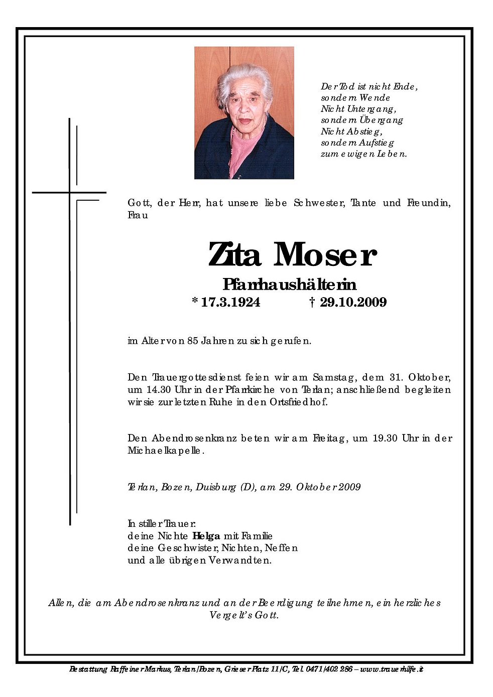 Den Trauergottesdienst feien wir am Samstag, dem 31. Oktober, um 14.30 Uhr in der Pfarrkirche von Terlan; anschließend begleiten wir sie zur letzten Ruhe in den Ortsfriedhof.