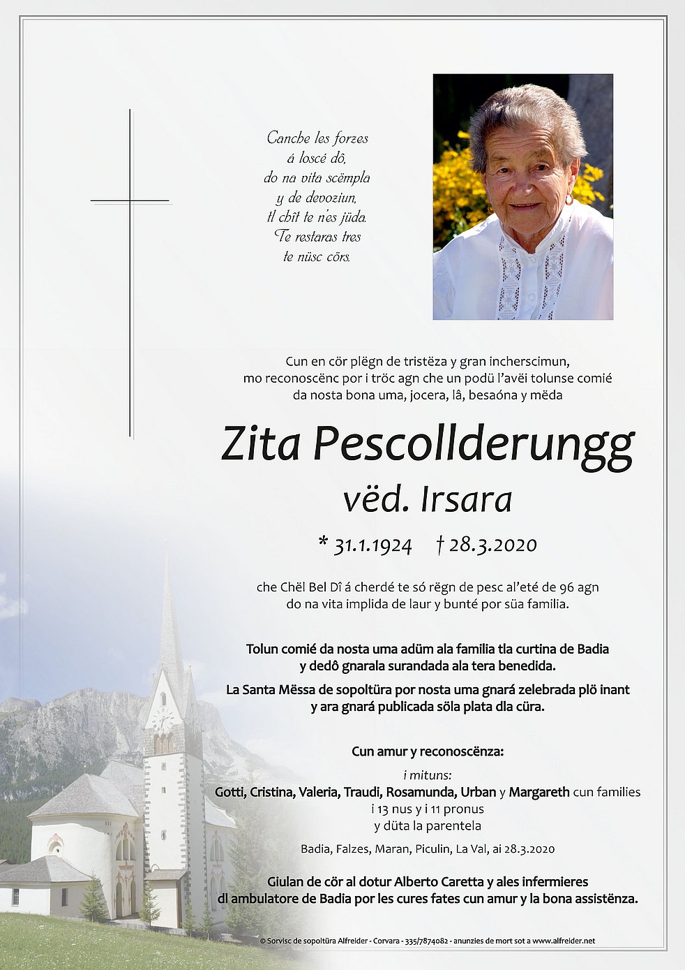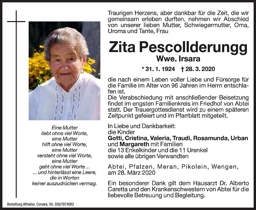 Ein besonderer Dank gilt dem Hausarzt Dr. Alberto Caretta und den Krankenschwestern von Abtei für die liebevolle Betreuung und Begleitung.