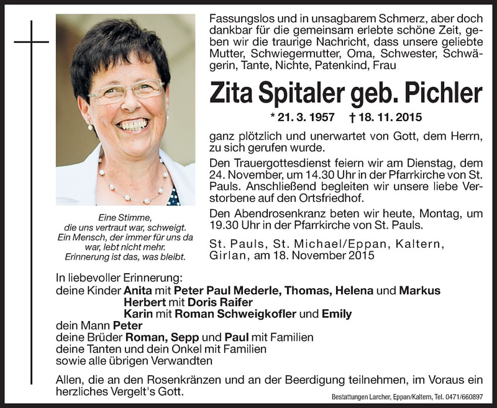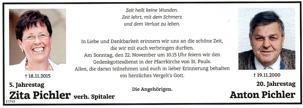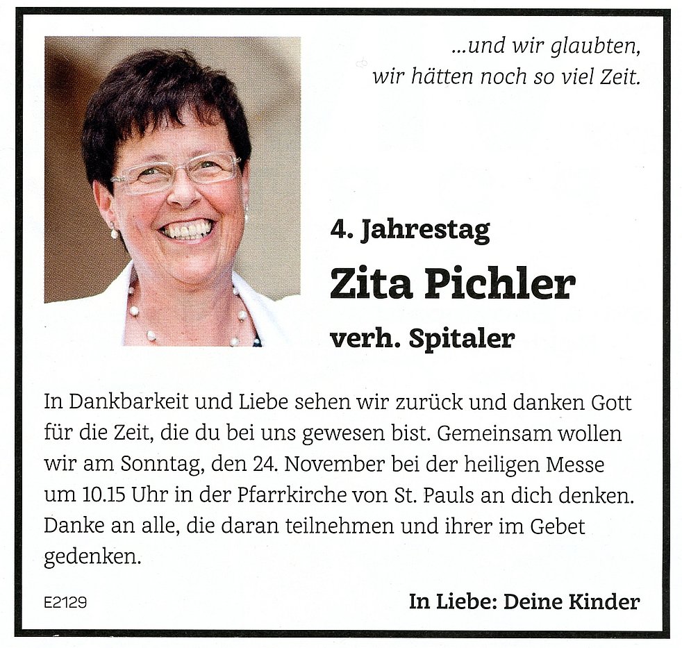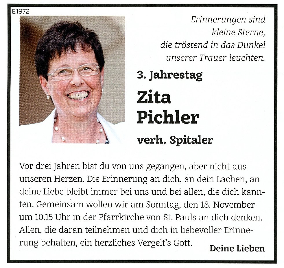 Den Trauergottesdienst feiern wir am Dienstag, dem 24. November um 14.30 Uhr in der Pfarrkirche von St. Pauls. Anschließend begleiten wir unsere liebe Verstorbene auf den Ortsfriedhof.
