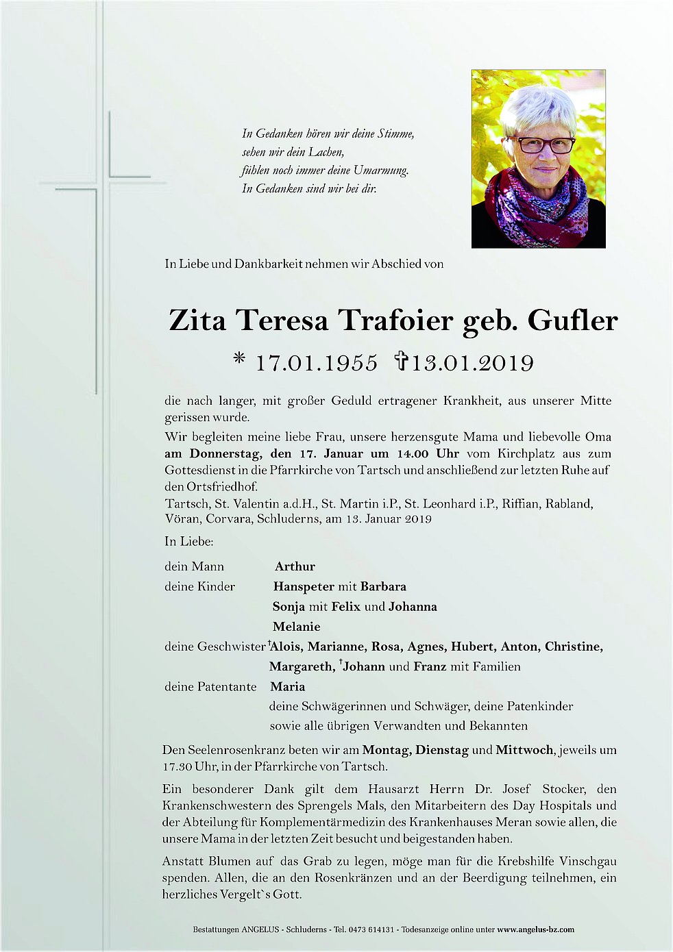 Wir begleiten meine liebe Frau, unsere herzensgute Mama und liebevolle Oma am Donnerstag, den 17. Januar um 14.00 Uhr vom Kirchplatz aus zum Gottesdienst in die Pfarrkirche von Tartsch und anschließend zur letzten Ruhe auf den Ortsfriedhof.