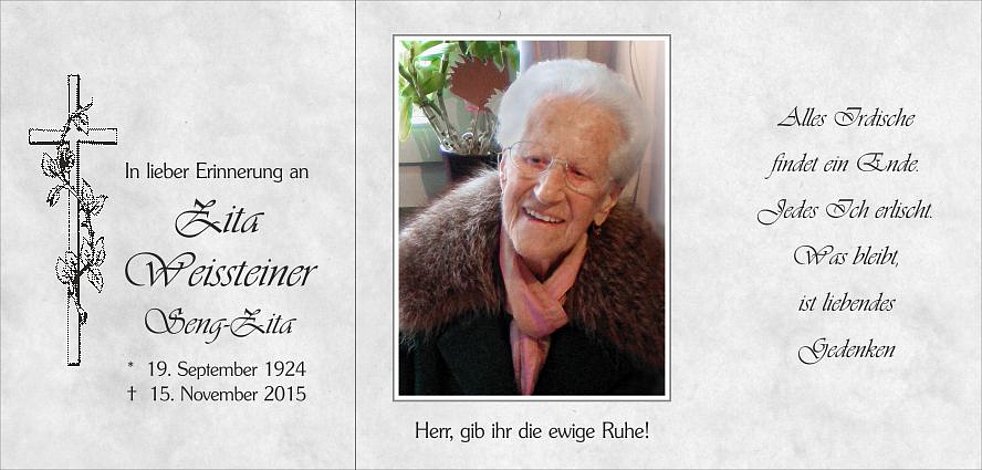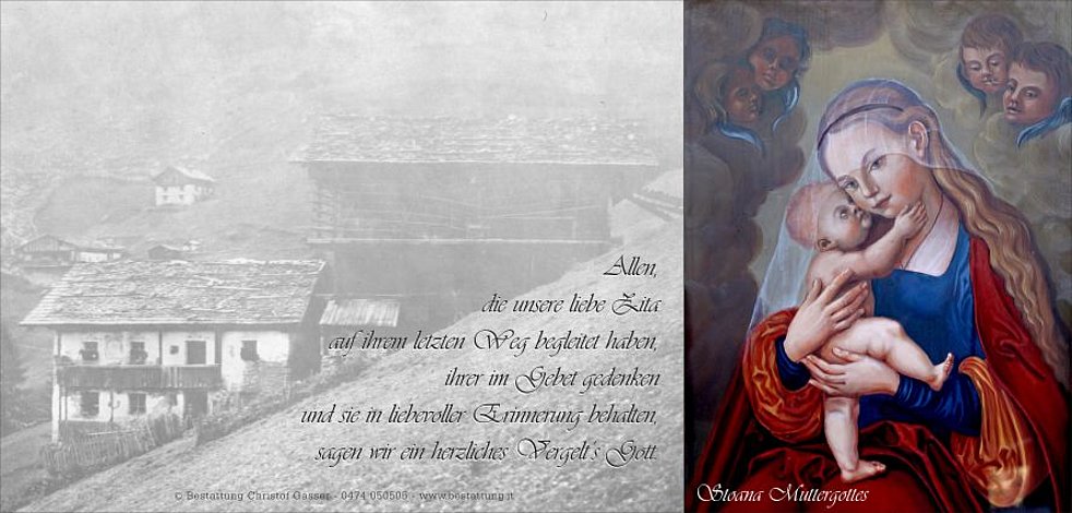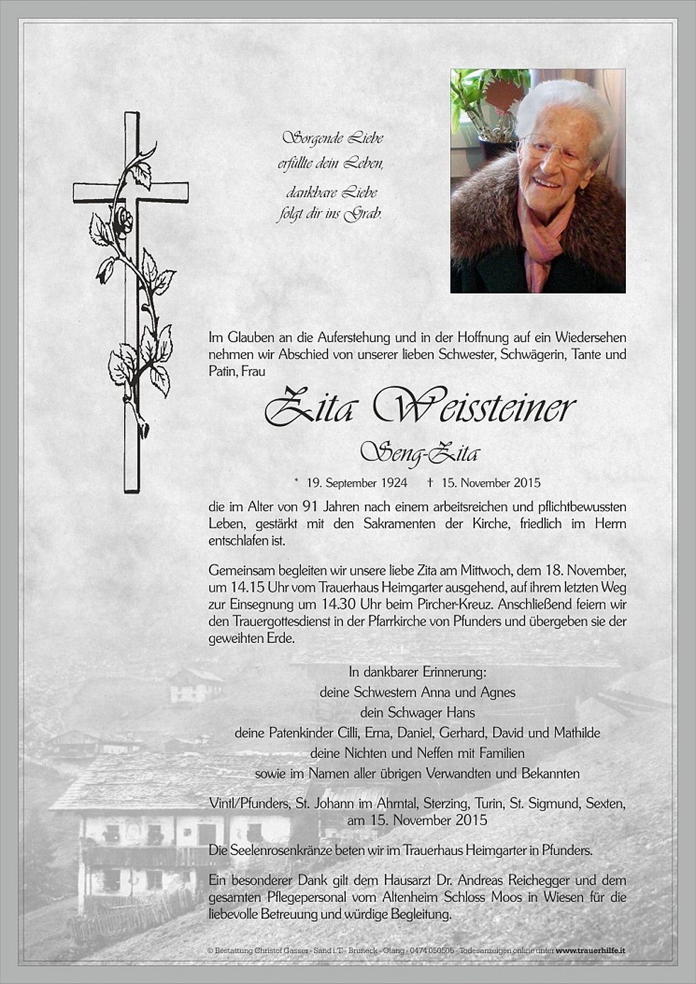 Gemeinsam begleiten wir unsere liebe Zita am Mittwoch, dem 18. November, um 14.15 Uhr vom Trauerhaus Heimgarter ausgehend, auf ihrem letzten Weg zur Einsegnung um 14.30 Uhr beim Pircher-Kreuz. Anschließend feiern wir den Trauergottesdienst in der Pfarrkirche von Pfunders und übergeben sie der geweihten Erde.