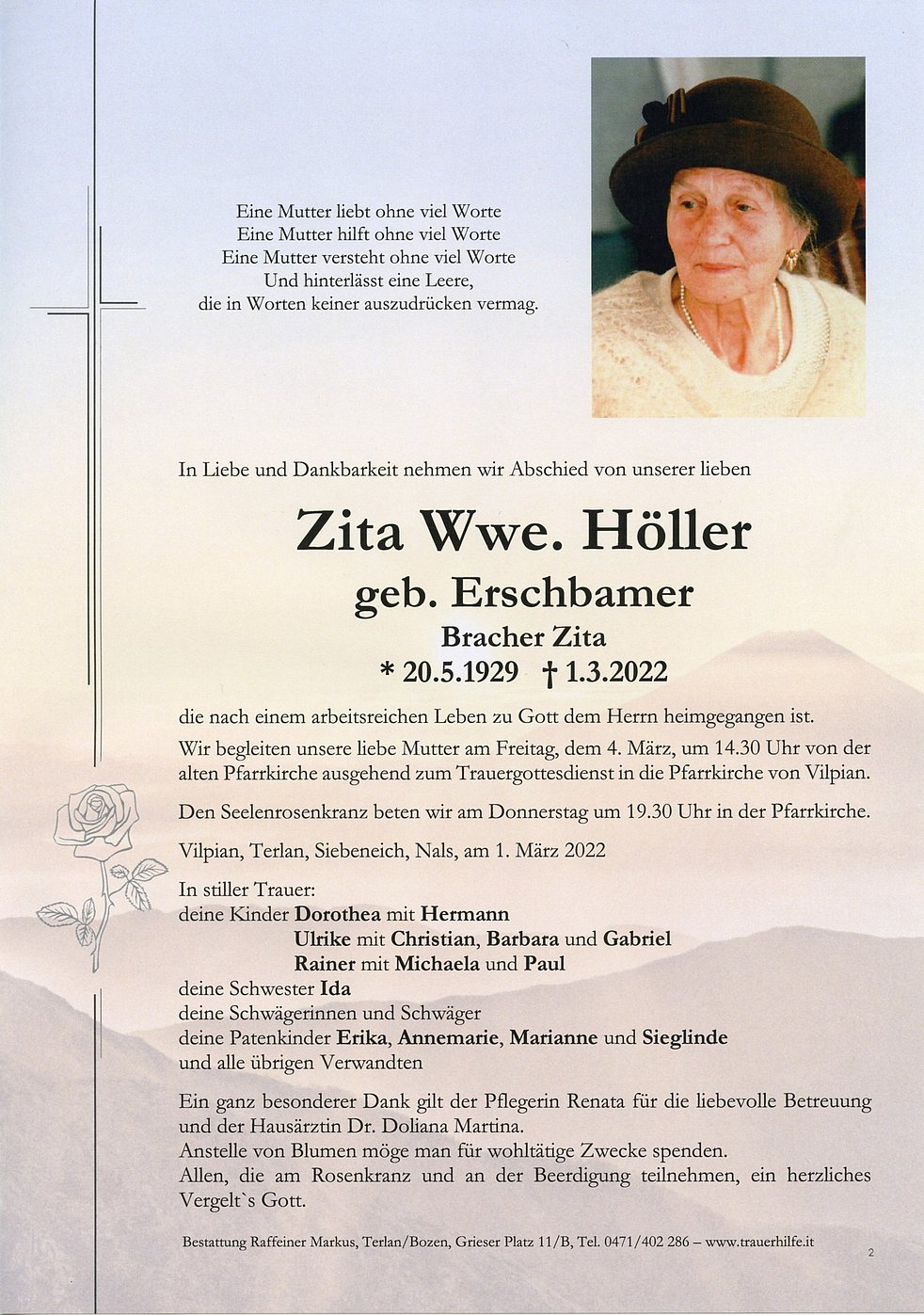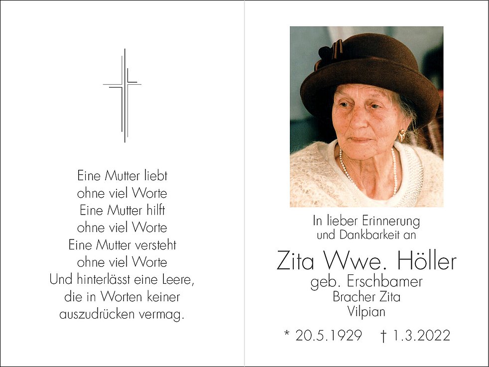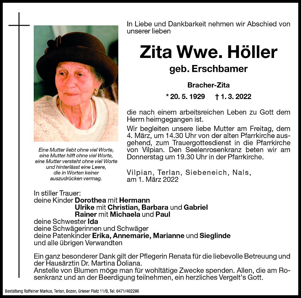 Wir begleiten unsere liebe Mutter am Freitag, dem 4. März, um 14.30 Uhr von der alten Pfarrkirche ausgehend zum Trauergottesdienst in die Pfarrkirche von Vilpian.