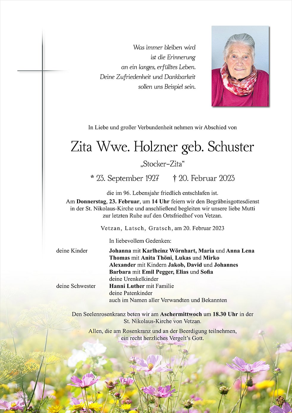 Am Donnerstag, 23. Februar, um 14 Uhr feiern wir den Begräbnisgottesdienst in der St. Nikolaus-Kirche und anschließend begleiten wir unsere liebe Mutti zur letzten Ruhe auf den Ortstfriedhof von Vetzan.