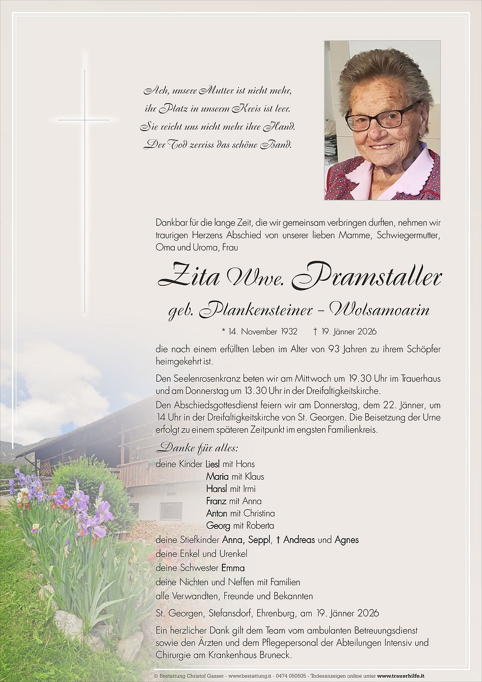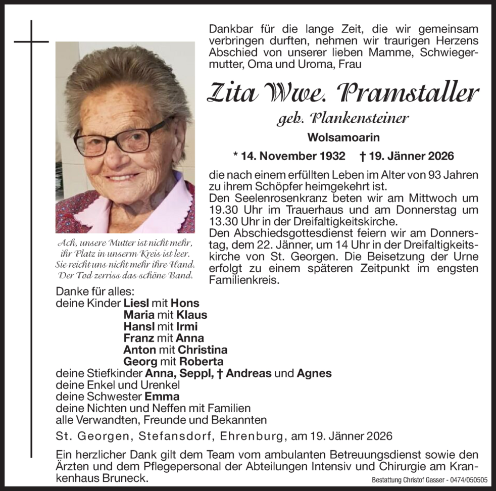 Den Abschiedsgottesdienst feiern wir am Donnerstag, dem 22. Jänner, um 14 Uhr in der Dreifaltigkeitskirche von St. Georgen. Die Beisetzung der Urne erfolgt zu einem späteren Zeitpunkt im engsten Familienkreis.