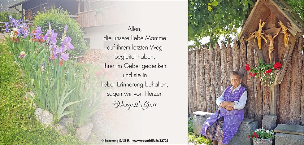 Dankbar für die lange Zeit, die wir gemeinsam verbringen durften, nehmen wir traurigen Herzens Abschied von unserer lieben Mamme, Schwiegermutter, Oma und Uroma, Frau