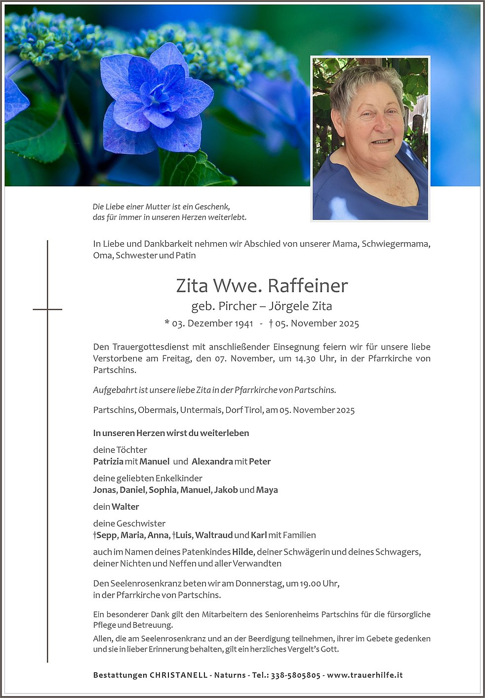 Den Trauergottesdienst mit anschließender Einsegnung feiern wir für unsere liebe Verstorbene am Freitag, den 07. November, um 14.30 Uhr, in der Pfarrkirche von Partschins.