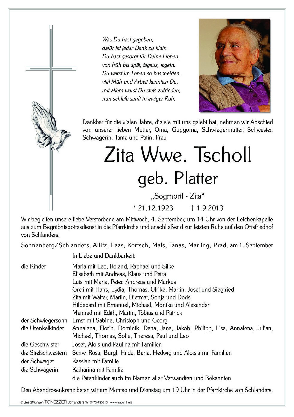 Wir begleiten unsere liebe Verstorbene am Mittwoch, 4. September, um 14 Uhr von der Leichenkapelle aus zum Begräbnisgottesdienst in die Pfarrkirche und anschließend zur letzten Ruhe auf den Ortsfriedhof von Schlanders.