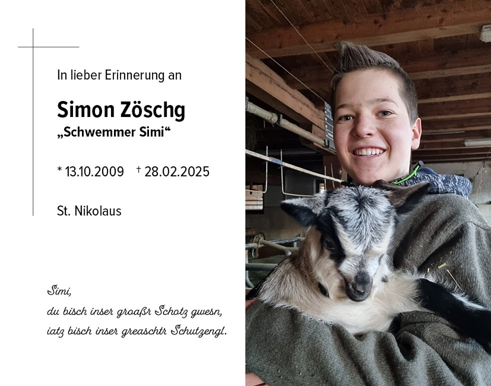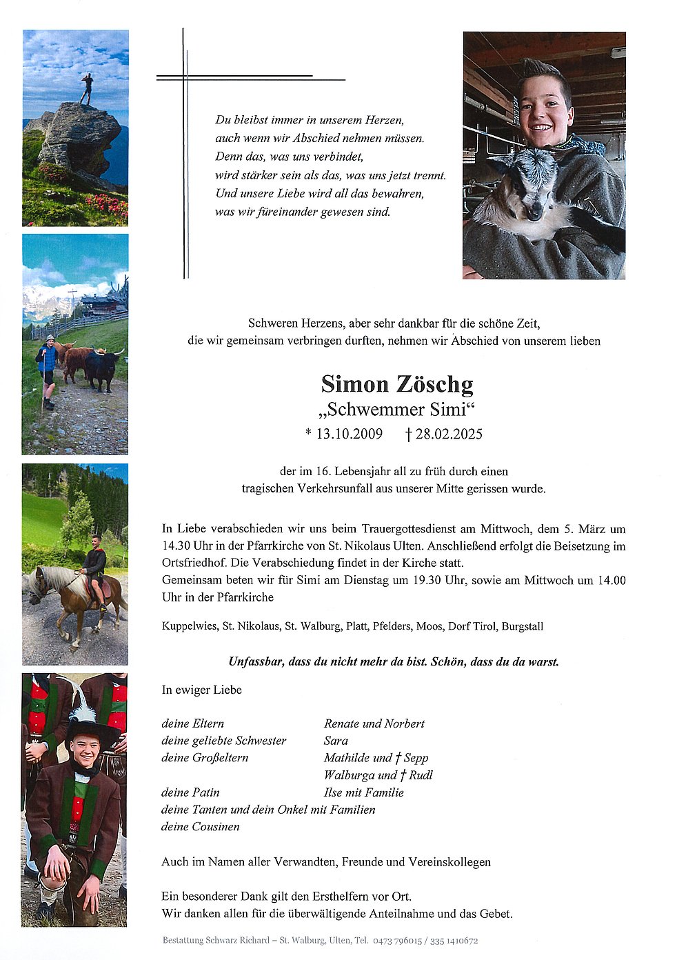 In Liebe verabschieden wir uns beim Trauergottesdienst am Mittwoch, dem 5. März um 14.30 Uhr in der Pfarrkirche von St. Nikolaus Ulten. Anschließend erfolgt die Beisetzung im Ortsfriedhof. Die Verabschiedung findet in der Kirche statt.